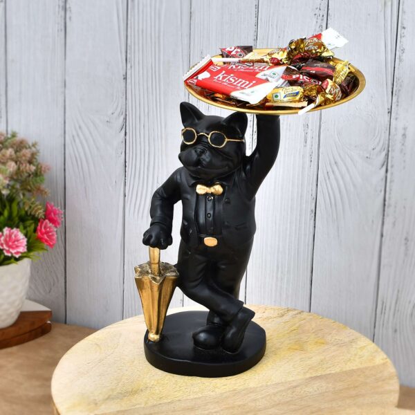 Black Bulldog Statue Tabletop | Polyresin Figurine with Glasses, Umbrella & Tray for Home & Office Decoration
