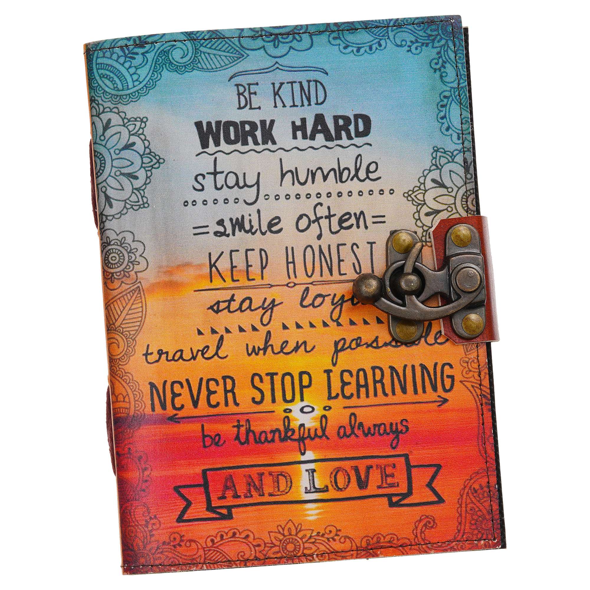 Be kind, work hard, stay humble Quoted | Vintage Handmade Genuine Leather Journal | Premium Antique Lock Closure, 200 Handmade White Pages