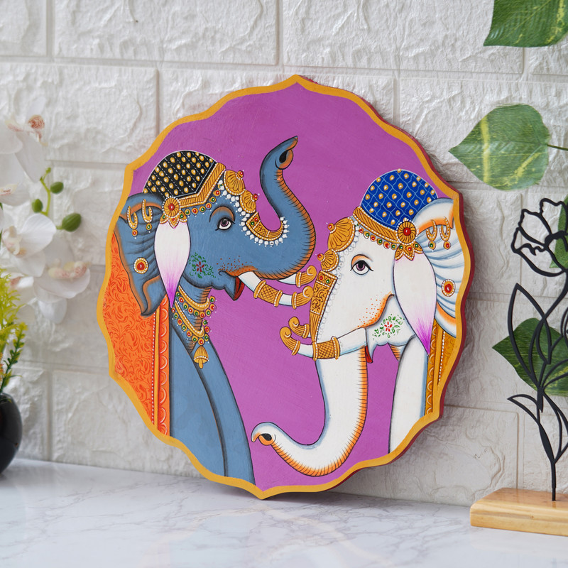 Elevate your space with a touch of traditional Indian art through this stunning Hand Painted Pichwai Painting. This exquisite piece beautifully depicts two majestic elephants standing peacefully on a detailed purple plate. Each painting is meticulously crafted by skilled artisans, making it a unique and soulful addition to your home.