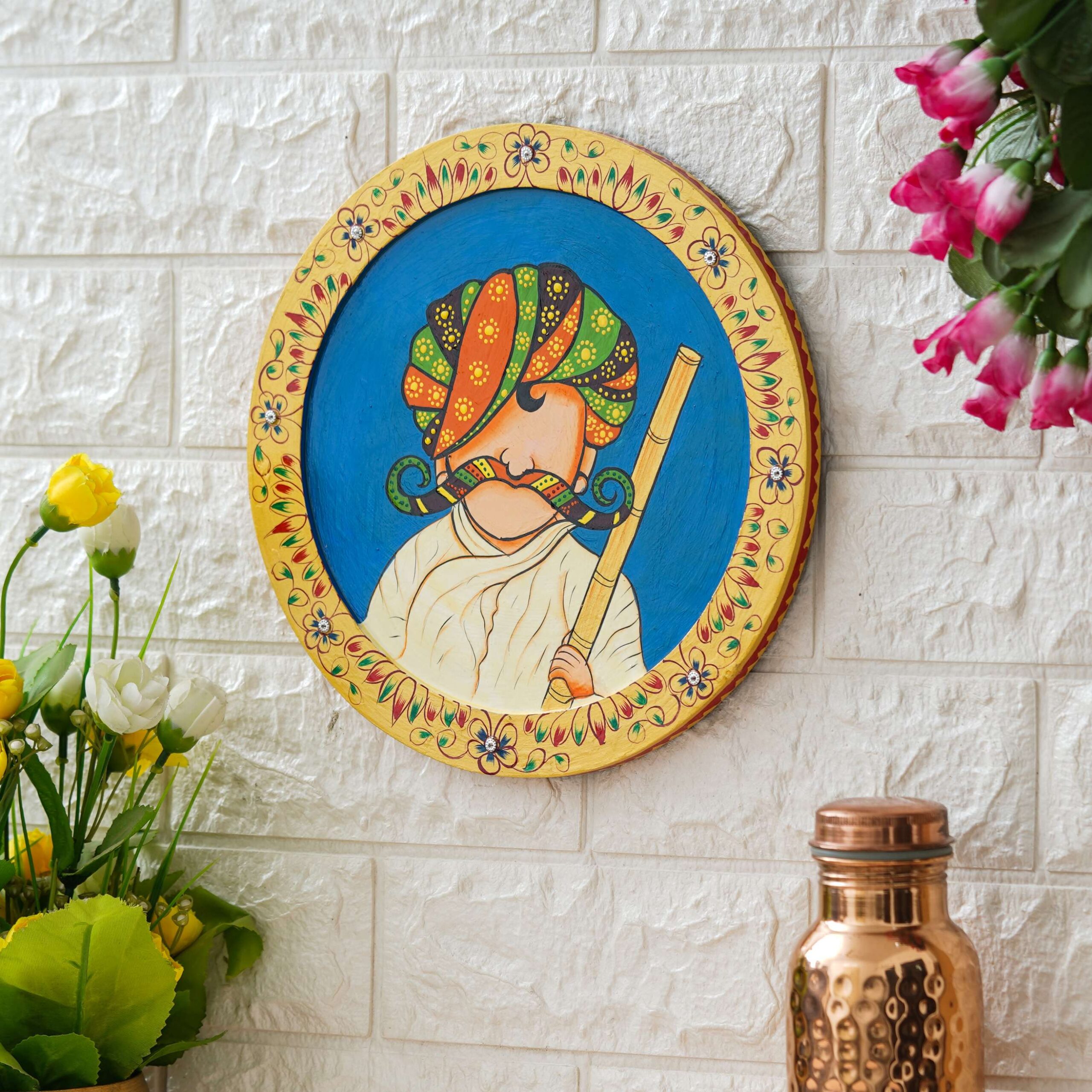 Elevate your space with this stunning Hand Painted Pichwai Painting of a noble Rajasthani Man. This exquisite piece beautifully captures a man with a traditional turban and moustache against a serene blue background. Each painting is a masterpiece of traditional Indian art, meticulously crafted by skilled artisans, making it a soulful and unique addition to your home.