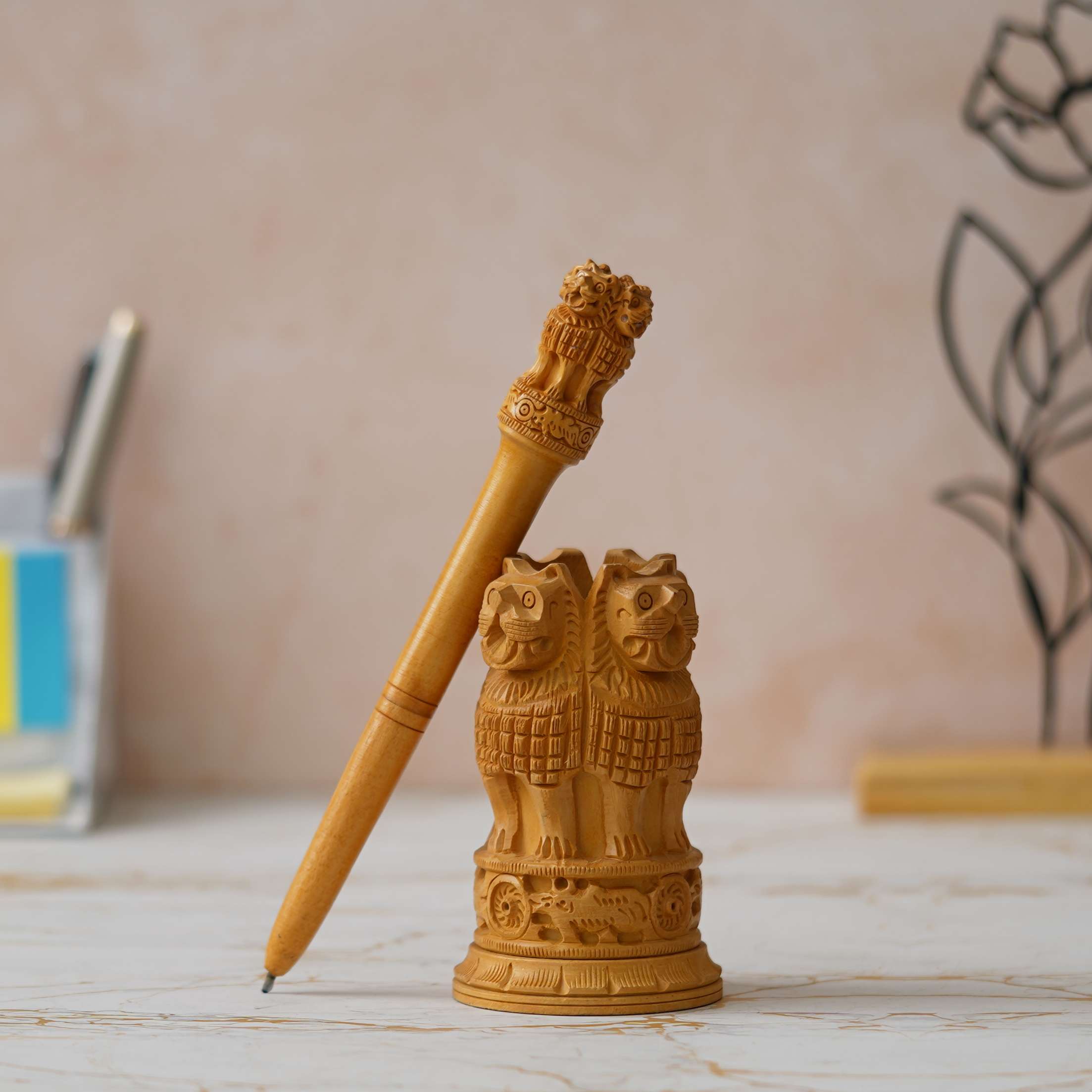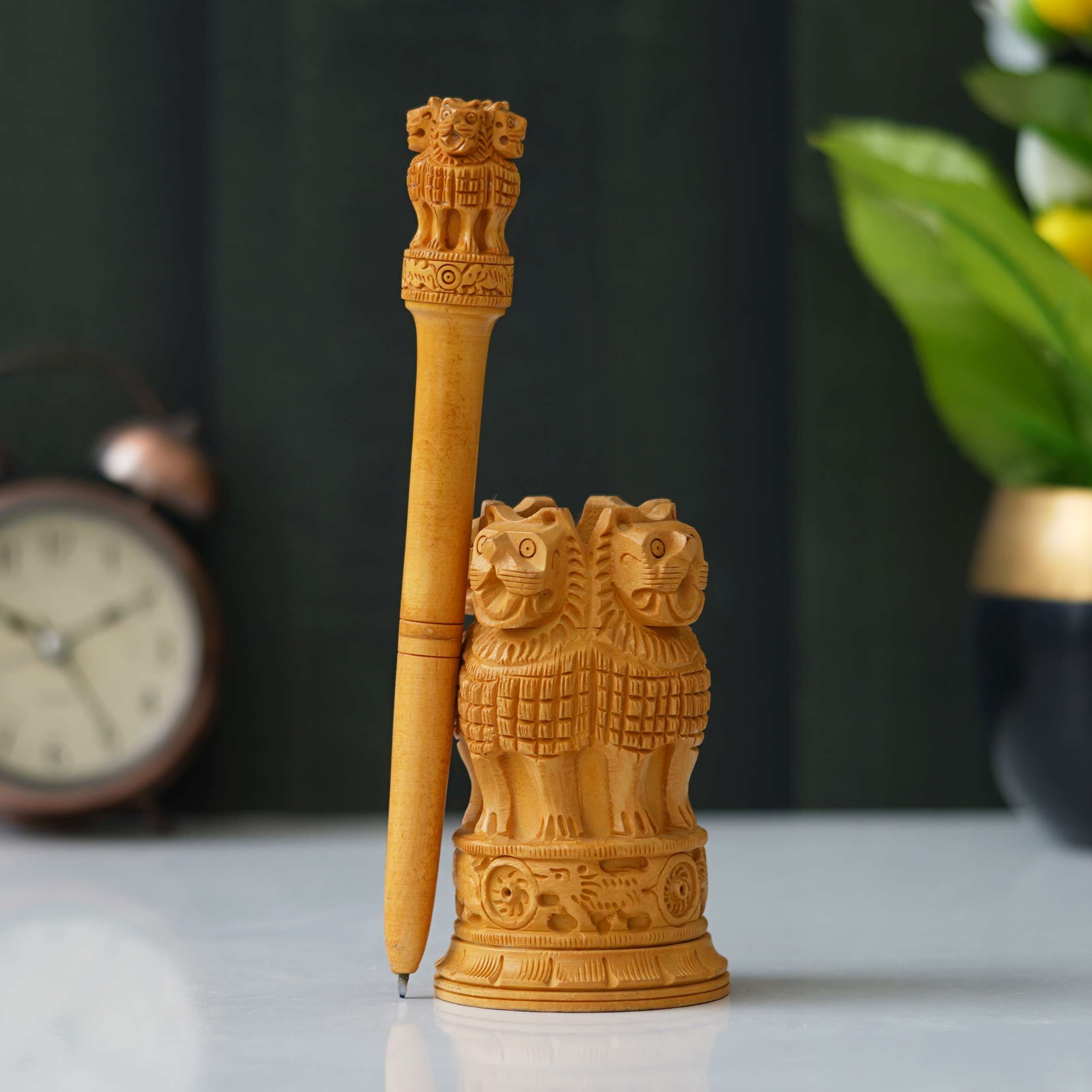 Crafted from quality wood, this unique piece of Indian Home Décor is a powerful reminder of ancient philosophy and modern sovereignty. It serves as a majestic showpiece figurine for your living room, office desk, or library. This timeless replica is an ideal cultural gift for patriots, history enthusiasts, or international colleagues.